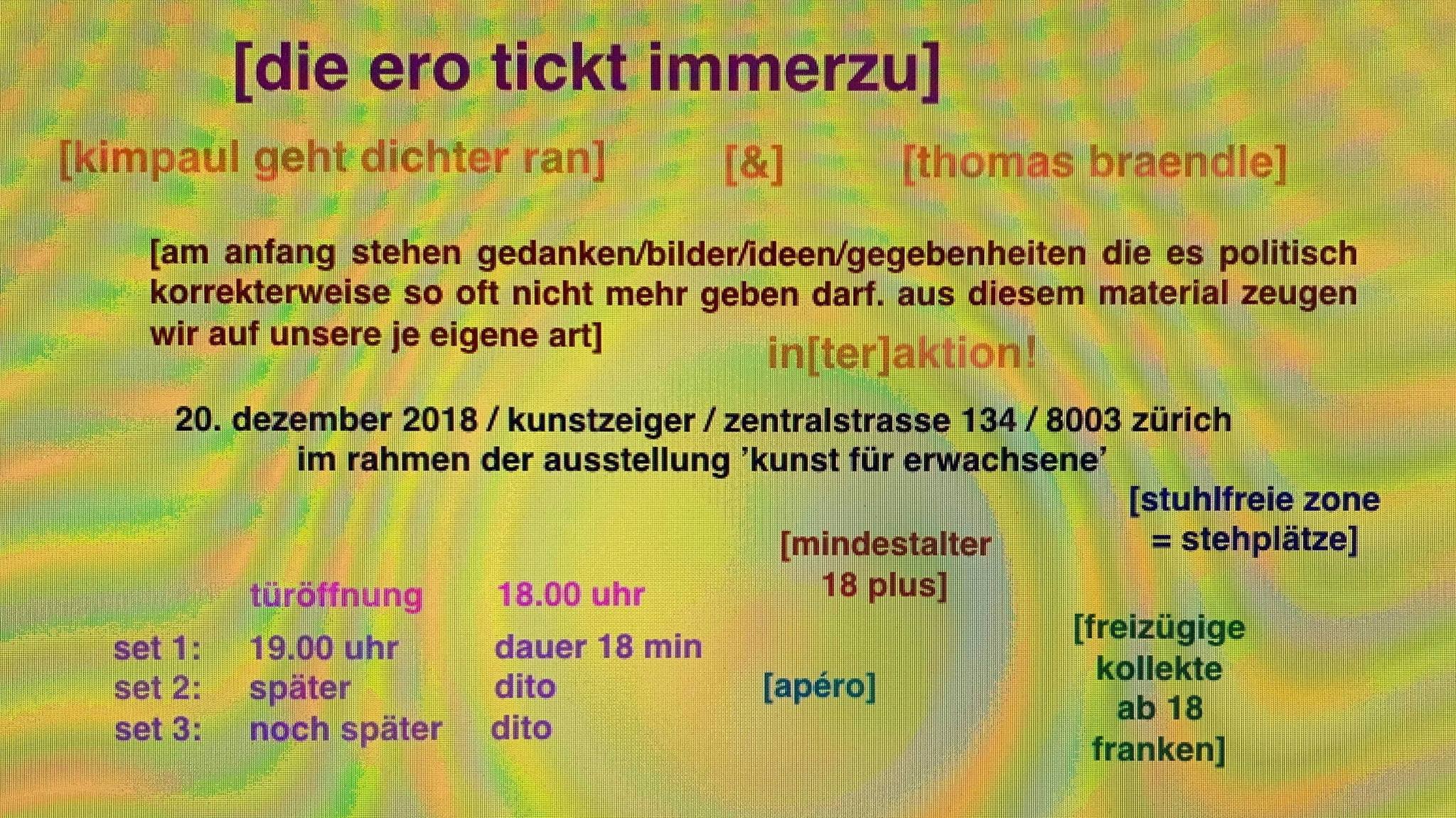 Kim Paul fühlt unsere Herzen mit erotischer Poesie am verschneiten Donnerstag 20. Dezember mit viel Witz und Wein in der Galerie Kunstzeiger Zürich. Du kommst auch und lässt dich schmunzelnd gehen mit offenem vollem Mund stehend im Raum gefüllt mit visualisiertem Kitsch des Motion Artisten Nierika27.